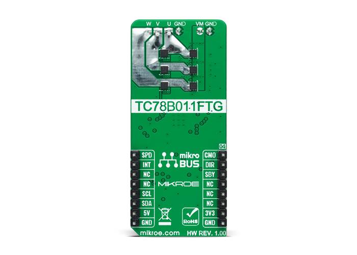 This Click board™ has several operational modes: Standby, Idle, Brake, and Error Mode. Standby mode is available to reduce the power consumption, controlled by the SBY pin routed to the CS pin of the mikroBUS™ socket, together with register settings. After Power-on, with the SBY pin disabled, the TC78B011FTG reads parameters from NVM and stores them in the registers. After that, IC goes to the Brake sequence and then moves to Idle mode. The brake function is controllable by a register setting or an onboard SW1 switch. The TC78B011FTG starts the motor by Start-Up sequence with the speed control command set. When an abnormal condition is detected, IC moves to Error mode and automatically restarts after restart time. In Error mode with Stop as a speed control command, the TC78B011FTG will move to Idle mode.