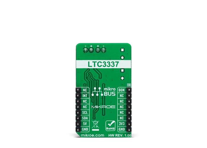 This Click board™ communicates with MCU using the standard I2C 2-Wire interface to read data and configure settings, supporting Standard Mode operation with a clock frequency of 100kHz and Fast Mode up to 400kHz. The LTC3337 also integrates additional state of health monitoring, which measures and reports through the I2C interface, such as battery voltage, battery impedance, and temperature to quantify the battery's charge state and health. In addition, it also has a programmable discharge alarm threshold based on this state of charge (SOC). An interrupt is generated at the INT pin of the mikroBUS™ socket when the threshold is reached.