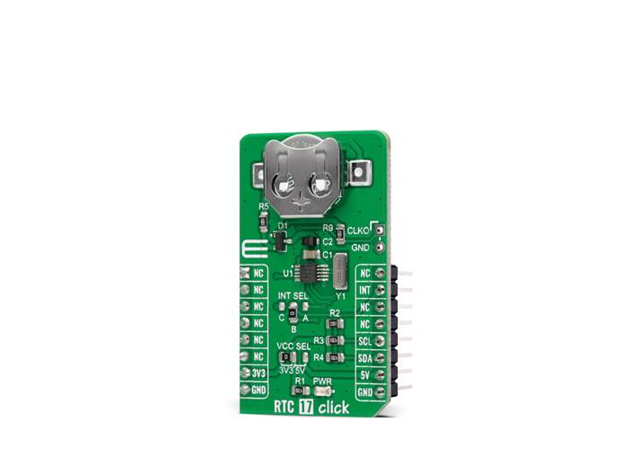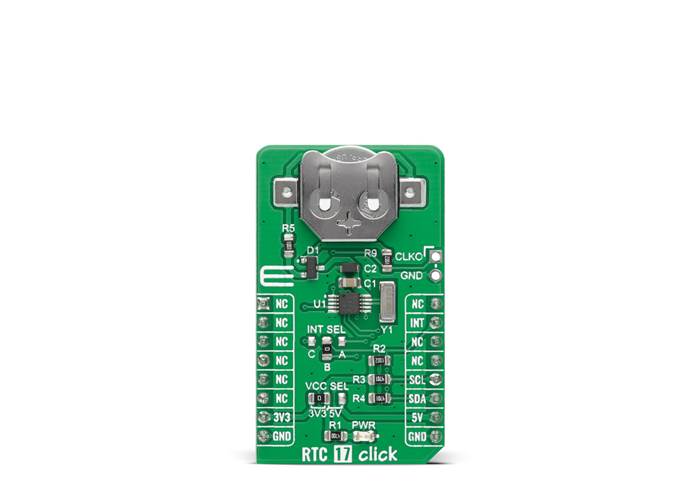 RTC 17 Click is a compact add-on board that accurately keeps the time of a day. This board features the RV5C387A, a CMOS real-time clock with a built-in interrupt generation function from Nisshinbo Micro Devices Inc, to perform serial transmission of time and calendar data to the MCU. The BU9873 provides information like year, month, day, weekday, hours, minutes, and seconds based on a 32.768kHz quartz crystal through an I2C serial interface to transmit time and calendar data to the MCU. It also has an alarm function that outputs an interrupt signal to the MCU when the day of the week, hour, or minute matches with the preset time. This Click board™ is suitable for various time-keeping applications, including daily alarms, metering applications, and others requiring an accurate RTC for their operation.