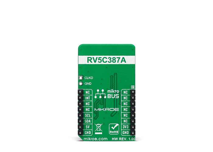 RTC 17 Click as its foundation uses the RV5C387A, an I2C configurable real-time clock/calendar optimised for low power operations from Nisshinbo Micro Devices Inc. The RV5C387A is configured to transmit calendar and time data to the MCU and comes with an integrated interrupt generation function. It reads and writes time data from and to the MCU in units ranging from seconds to the last two digits of the calendar year. The calendar year will automatically be identified as a leap year when its last two digits are a multiple of 4. Consequently, leap years up to the year 2099 can automatically be recognised.