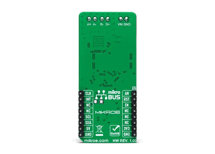 In addition to the I2C communication, several GPIO pins connected to the mikroBUS™ socket are also used. The Enable pin, labelled as EN and routed to the CS pin of the mikroBUS™ socket, optimizes power consumption used for power ON/OFF purposes. Also, a simple rotation direction function routed to the AN pin on the mikroBUS™ socket allows MCU to manage the direction of the stepper motor (clockwise or anti-clockwise), while the RST pin of the mikroBUS™ socket initializes an electrical angle in the internal counter to set an initial position.