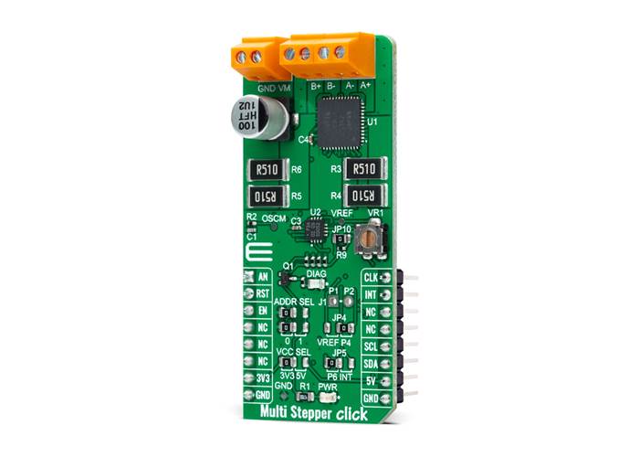 Multi Stepper Click as its foundation uses the TB67S209FTG, a two-phase bipolar stepping motor driver using a PWM chopper from Toshiba Semiconductor. The TB67S209FTG comes with a built-in clock-in decoder (CLOCK-in controlled), which means that each up-edge of the CLK signal, routed to the PWM pin of the mikroBUS™ socket, will shift the motor’s electrical angle per step. It also incorporates a low on-resistance MOSFET output stage, which can deliver a 2.8A current with a motor output voltage rating of 47V, in addition to integrated protection mechanisms such as over-current, over-temperature, and under-voltage detection. In addition, it allows from full-step up to 1/32 steps resolution, with the help of which motor noise can be significantly reduced with smoother operation and more precise control.