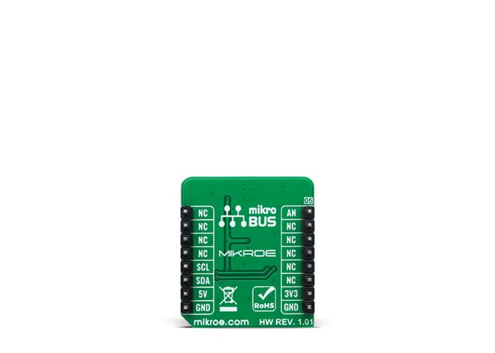 Since the sensor for operation requires a 5V logic voltage level only, this Click board™ also features the PCA9306 voltage-level translator from Texas Instruments. The I2C interface bus lines are routed to the dual bidirectional voltage-level translator, allowing this Click board™ to work with both 3.3V and 5V MCUs properly.