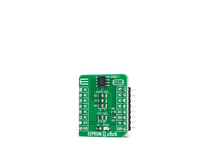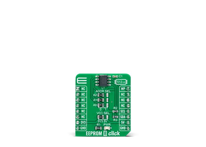 EEPROM 8 Click is a compact add-on board that contains a highly reliable nonvolatile memory solution. This board features the CAV24C512, a 512-Kb electrically erasable programmable memory with enhanced hardware write protection for entire memory from ON Semiconductor.