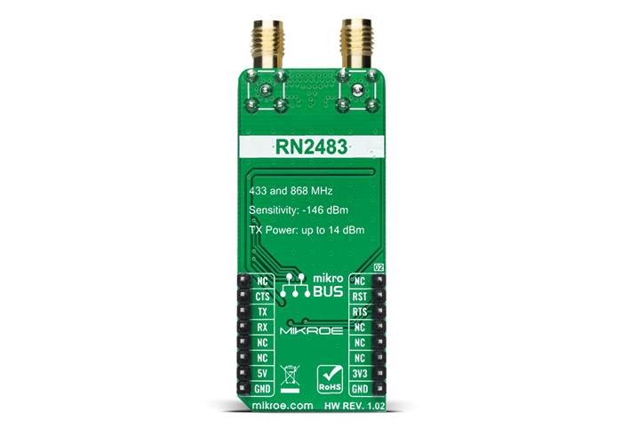 Explanation of all the configuration parameters, as well as the in-depth explanation of each feature of the RN2483 module, can be found in the Command Reference User's Guide. Please note that improper settings of some parameters might render the device unresponsive. Also, this Click board™ can be reset through the Hardware Reset pin, labelled as RST on the mikroBUS™ socket, by setting this pin to a low logic state.