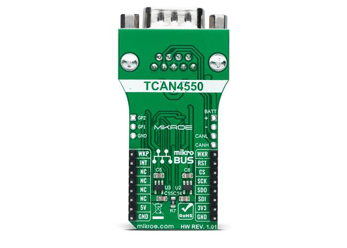 In addition to these features, the TCAN4550 also uses several GPIO pins connected to the mikroBUS™ socket. The RST pin the mikroBUS™ can perform the Hardware Reset function, which resets the device to the default settings and puts it into standby mode. This feature can also be achieved through the onboard push-button labelled as RST. Next to these pins, the ATA6571 uses the WKR pin as a dedicated wake-up request pin from a bus wake request and INT pin as an interrupt feature routed on the AN and INT pin of the mikroBUS™ socket. For interrupt purposes, the user can also use GPIO pins from the header positioned on the board's right side.