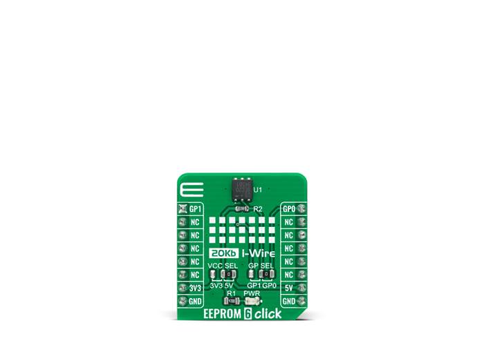 EEPROM 6 Click is a compact add-on board that contains a serial EEPROM memory that operates from the 1-Wire interface. This board features the DS28EC20, a 20480-bit EEPROM organised as 80 memory pages of 256 bits each from Analogue Devices.