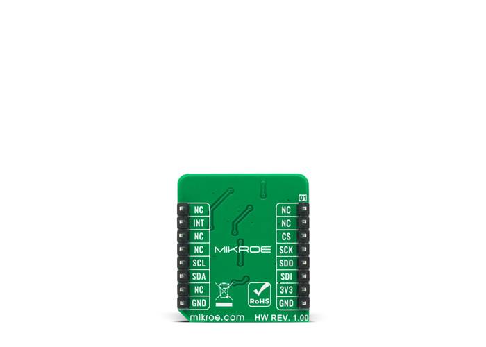 The ASM330LHH has a programmable interrupt system that can generate an interrupt signal two available pins. One of these two interrupt pins can be selected using the INT SEL jumper (JP4), which is routed to the INT pin of the mikroBUS™ socket. The event-detection smart programmable interrupts enable efficient and reliable motion-activated functions, implementing hardware recognition of free-fall events, 6D orientation, activity or inactivity, and wakeup events.