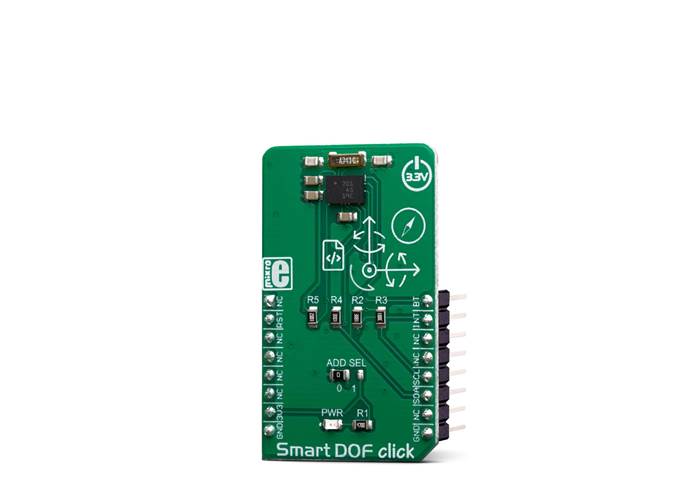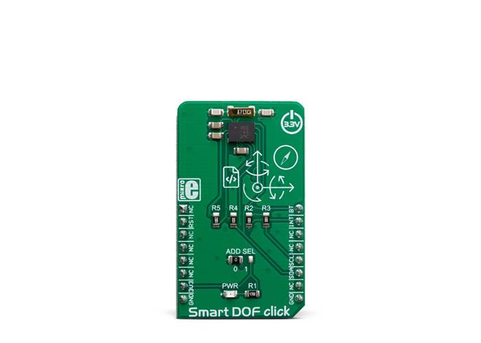 Built to be used as a simple solution, this 9 DOF SiP provides an output which can be used directly, with no tedious conversions required. Acting as a co-processor, it reduces the workload from the host MCU, allowing it to be used for other tasks, such as handling of the interrupt requests. Despite its complexity, BN080 SiP still reduces the overall power consumption, allowing various "always-on" features which can be used to wake up the host MCU and the rest of the system. Thanks to its many features, SmartDOF Click can be used for the development of various motion-based applications, including VR/AR applications, robotics, VR/AR headsets, wearable motion controllers, and similar.