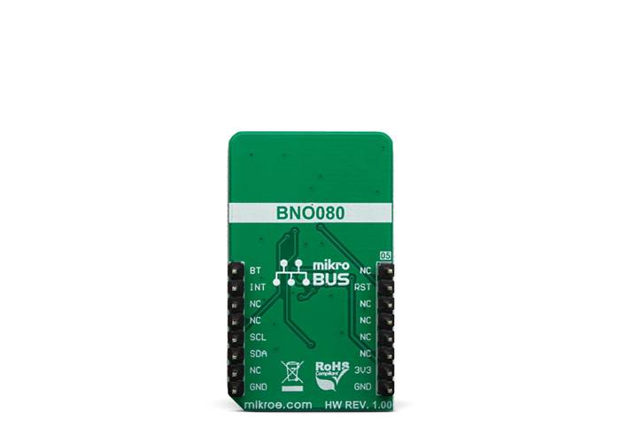 The BNO080 will be started in the Bootloader mode. This mode allows updating the embedded firmware over the I2C interface. When this pin is pulled to a LOW logic level, the device will boot up in the Bootloader mode after the next restart. This pin is routed to the mikroBUS™ PWM pin and it is labelled as BT. The BNO080 datasheet describes the firmware update process in more details.