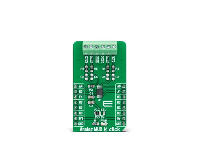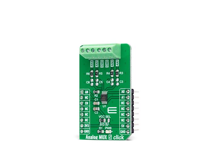 Analogue MUX 5 Click is a compact add-on board that switches one of many inputs to one output. This board features the MAX4634, a fast, low-voltage four-channel CMOS analogue multiplexer from Analogue Devices. This low-voltage multiplexer operates from both mikroBUS™ power rails and features 4Ω maximum ON-resistance (RON). CMOS switch construction allows the processing of analogue signals within the supply voltage range. It is also characterized by an easy way of management, only through a couple of signals from the mikroBUS™ socket. This Click board™ is suitable for various applications, from industrial and instrumentation to medical, consumer, communications, and more.