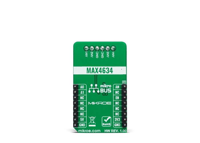 This Click board™ communicates with MCU using several GPIO pins. It can be enabled or disabled through the EN pin routed to the CS pin of the mikroBUS™ socket; hence, offering a switch operation to turn ON/OFF power delivery to the MAX4634. It also provides two address signals, labelled as A0 and A1 and routed to the PWM and INT pins of the mikroBUS™ socket, that determine the activation of the desired analogue input channel based on their setup while monitoring of that input analogue signal is done using AN pin of the mikroBUS™ socket.