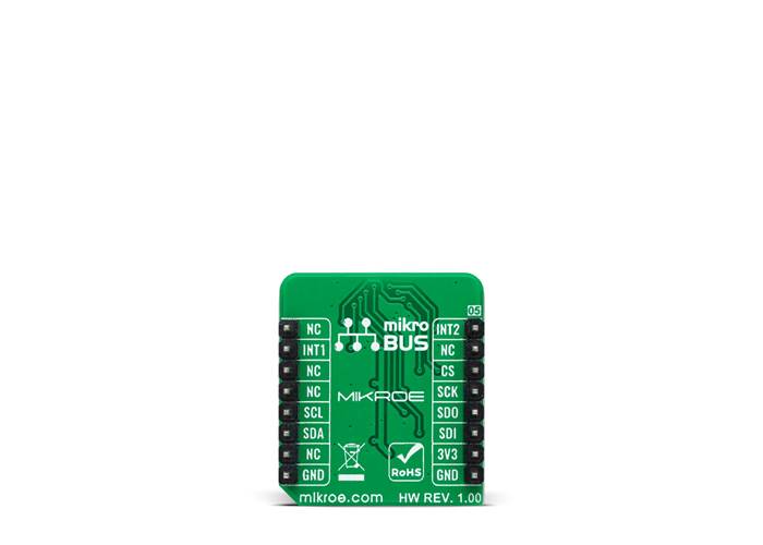 The FXLS8974CF also possesses two interrupts, INT1 and INT2, routed to the INT and AN pins on the mikroBUS™ socket used to signal MCU that an event has been sensed, entirely programmed by the user through the I2C/SPI interface. Also, this Click board™ provides the ability to use the boot mode of the FXLS8974CF by positioning SMD jumpers labelled as BT MODE to an appropriate position. Depending on the selected position, the device can be set in the default operating mode by setting the jumper to position 0 or in Motion Detection Mode to position 1.