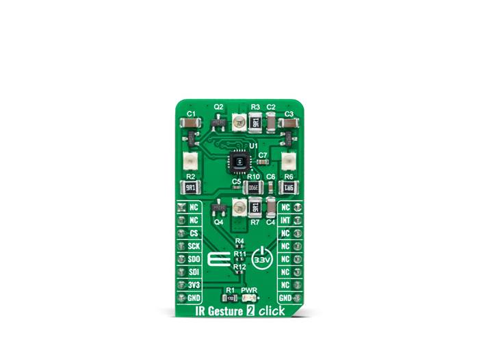 IR Gesture 2 Click is a compact add-on board that provides contactless gesture recognition. This board features the MAX25405, a data-acquisition system for the gesture and proximity sensing from Analogue Devices. Detection distance is improved by integrating a complete optical system with a lens, aperture, visible light filter, and a 6x10 photodetector array. The proximity, hand detection, and gesture recognition functions of the MAX25405 operate by detecting the light reflected from the controlled IR-LED light sources driven directly from the MAX25405. It can also detect these gestures even when exposed to bright ambient light and process data from the sensor through an SPI interface. This Click board™ is suitable for various gesture sensing applications, from hand swipe gestures (left, right, up, down, wave), air click, and flicks to multizone proximity detection.