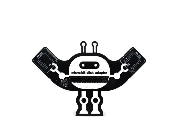 The micro:bit Click adaptor comes comes equipped with two proprietary mikroBUS™ sockets, allowing all the Click board™ devices to be interfaced with the micro:bit with no efforts at all. It is enough to place the small standardized add-on board of your choice on the top of the mikroBUS™ socket - and click it in. That is why this small add-on board is called Click board™ - it just clicks!