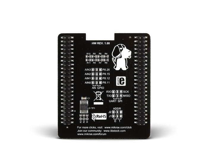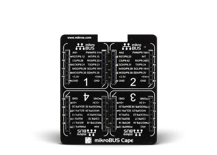The mikroBUS Cape is an extension for BeagleBone Black, the popular low-cost development platform running Linux. This simple cape has four mikroBUS sockets that allow you to connect more than 130 different types of Click boards™ to BeagleBone.