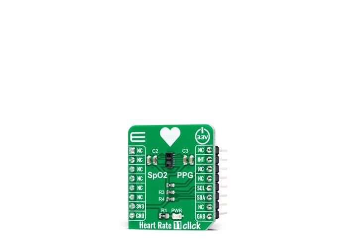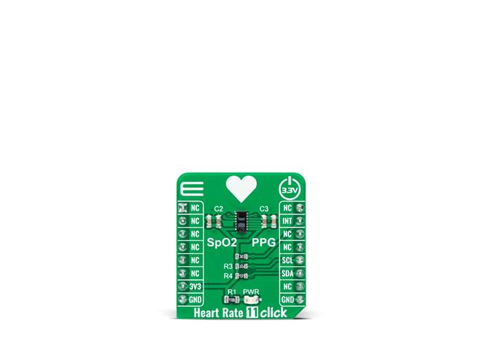 Heart Rate 11 Click as its foundation uses the OB1203, a fully integrated all-in-one biosensor module that measures heart rate and blood oxygen levels from Renesas. The OB1203 combines all light sources, drivers, and sensor elements, in a single optically optimised package and can be used with just one side of a user’s finger because it uses the space-conserving reflective PPG method. The appropriate algorithm can determine human heart rate, respiration rate, and heart rate variability (a measure of stress) or blood oxygen saturation (SpO2) behind IR transmissive but visibly dark ink, allowing implementation in aesthetic industrial designs.