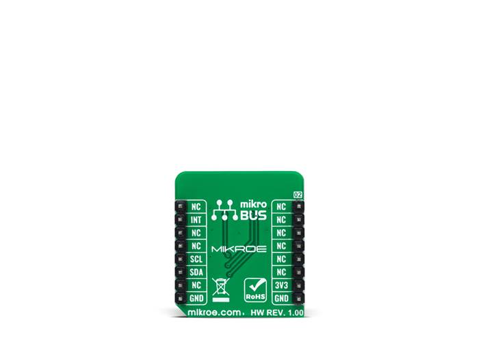 The OB1203 communicates with MCU using the standard I2C 2-Wire interface with a maximum clock frequency of 400kHz, fully adjustable through software registers. Also, it uses an interrupt pin, the INT pin of the mikroBUS™ socket, indicating when a specific interrupt event occurs, such as light, proximity, or photoplethysmography threshold crossed.