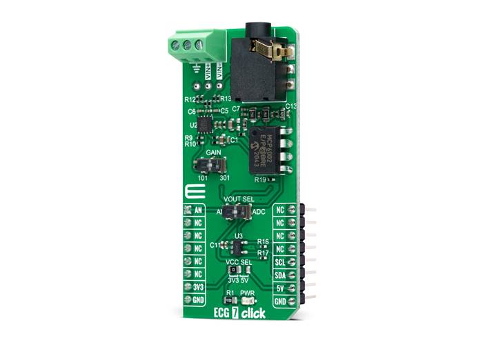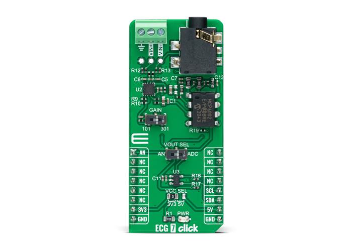 ECG 7 Click is a compact add-on board that records the heart's electrical activity. This board features the MCP6N16, a single zero-drift instrumentation amplifier with selectable gain from Microchip. In addition to the jack connector provided for connecting the cable with ECG electrodes, this Click board™ offers the possibility of connecting electrodes through screw terminals or an onboard header if the electrode connection does not match the jack connector. Besides, the user is allowed to process the output signal in analogue or digital form. This Click board™ is suitable for medical remote diagnostic equipment applications, such as electrocardiogram (ECG) measurement.
