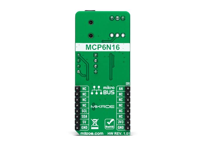 The head part of the board represents a differential amplification stage based on the MCP6N16, with the RC input filter providing a low-pass function for differential mode signals. This part also comes with selectable gain for the MCP6N16, performed by an onboard switch marked as GAIN, allowing users to quickly set the gain on the MCP6N16 to either 101V/V or 301V/V by setting the switch to an appropriate position. After that, the signal from MCP6N16 goes through amplification and buffering by the MCP6002 operational amplifier. Then the signal is ready for further processing in analogue or digital format.