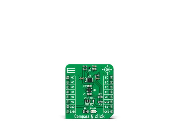 Compass 7 Click is a compact add-on board perfect for applications like an electronic compass. This board features the MMC5633NJL, a monolithic complete 3-axis AMR magnetic sensor with on-chip signal processing and an integrated digital bus from MEMSIC. It can measure magnetic fields within the full-scale range of ±30 Gauss (G) with up to 0.0625mG per LSB resolution at 20bits operation mode and 2mG total RMS noise level, enabling heading accuracy of ±1º in electronic compass applications. Also, an integrated SET/RESET function eliminates thermal variation-induced offset error (Null field output) and clears the residual magnetization resulting from powerful external fields. This Click board™ is suitable, as mentioned before, as an electronic compass but also can be used in various position sensing applications.