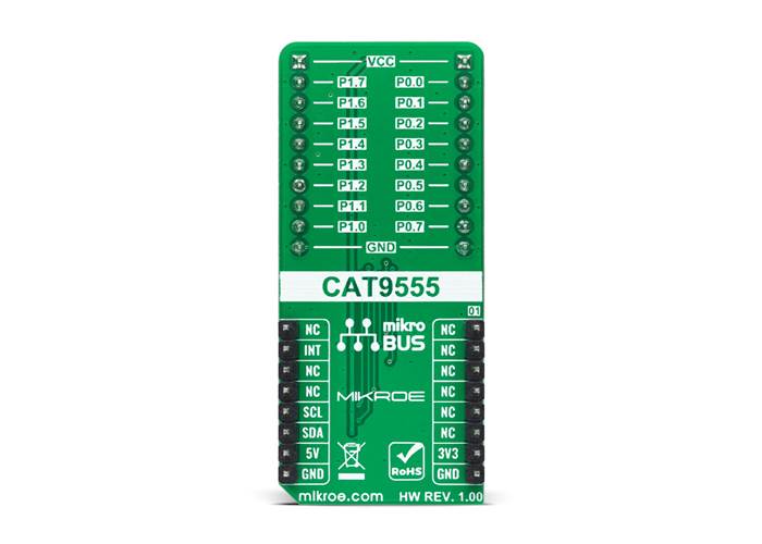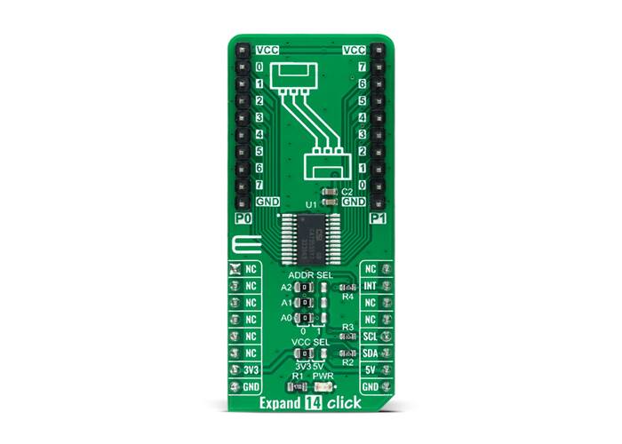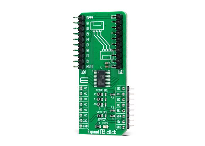 Expand 14 Click as its foundation uses the CAT9555, a general-purpose I/O expander from ON Semiconductor. It contains two 8-bit configuration ports (input or output), input, output, and polarity inversion registers, alongside an I2C-compatible serial interface, where any of the sixteen I/Os can be configured as an input or output by writing to the configuration register. This port expander represents a simple solution when additional I/Os are needed while keeping interconnections to a minimum; particularly great for sensors, power switches, LEDs, pushbuttons, and fans.