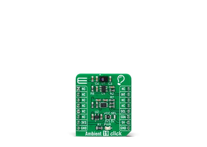 Ambient 19 Click communicates with MCU using the standard I2C 2-Wire interface with a maximum clock frequency of 400kHz, fully adjustable through software registers. Since the sensor for operation requires a power supply of 3.3V, this Click board™ also features the PCA9306 and SN74LVC1T45 voltage-level translators. The I2C interface bus lines are routed to the voltage-level translators allowing this Click board™ to work with both 3.3V and 5V MCUs properly. It also possesses an additional interrupt signal, routed on the INT pin of the mikroBUS™ socket, indicating when a specific interrupt event occurs, such as detecting a meaningful change in light intensity.