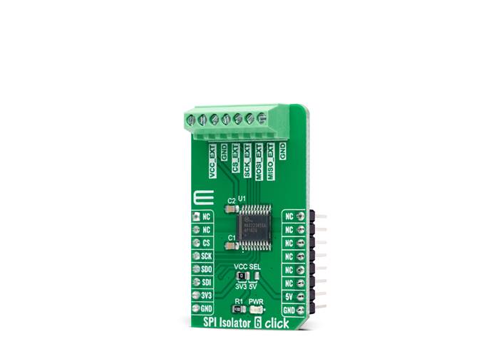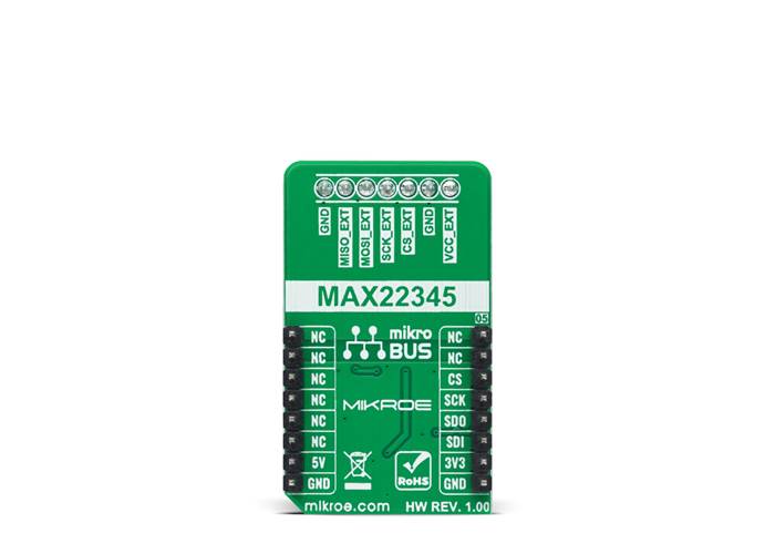 Because this Click board™ represents an isolator for SPI communication, it logically communicates with the MCU precisely through that communication. As already mentioned, the MAX22345 has two power pins for the A and B isolation sides, where it is possible to supply its B side with external voltage in the range of 1.7 to 5.5V by applying it to the terminal marked with VCC_EXT. In addition to the external power supply terminal, this Click board ™ also possesses another two terminals to which the isolated SPI data communication lines are routed.