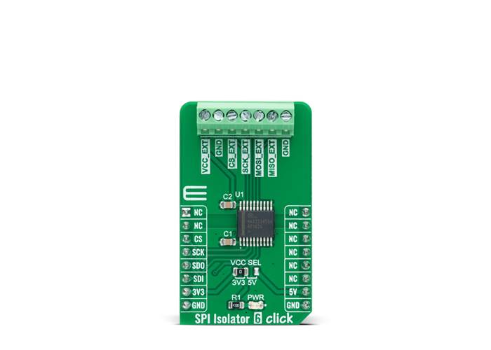 SPI Isolator 6 Click as its foundation uses the MAX22345, a four-channel digital isolator with a maximum data rate of 200Mbps from Analogue Devices. The MAX22345 provides galvanic isolation for digital signals transmitted between two ground domains and can withstand up to 784Vpeak of continuous isolation and up to 3.75kVRMS for up to 60 seconds. Besides, it also offers low-power operation, high electromagnetic interference (EMI) immunity, and stable temperature performance through Analog's proprietary process technology. Both power pins' wide supply voltage range allows the MAX22345 to be used for level translation and isolation.