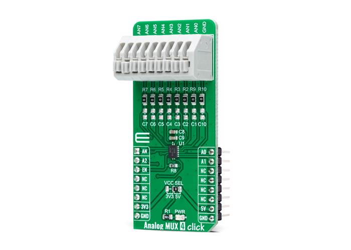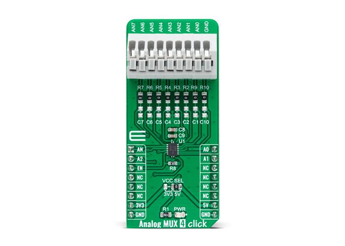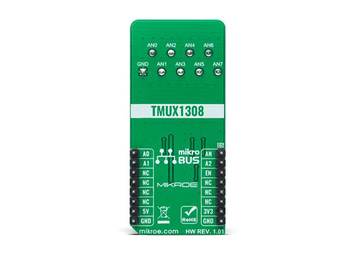 Analogue MUX 4 Click is a compact add-on board that switches one of many analogue inputs to one digital output. This board features the TMUX1308, a general-purpose 8:1 single-ended CMOS multiplexer (MUX) from Texas Instruments. The TMUX1308 has an internal injection current control which eliminates the need for external diode and resistor networks to protect the switch and keep the input signals within the supply voltage. It also supports bidirectional analogue and digital signals ranging from 0 to 5V, alongside several protection features allowing a reliable operation and protecting the device from potential damage. This Click board™ is suitable for various applications, from industrial to instrumentation, consumer, communications, and more.