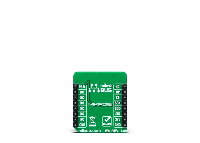 The configurable Write Protection, marked as WP and routed on the RST pin of the mikroBUS™ socket, prevents the block lock bits from being overwritten and must be held low to inhibit all the write operations to registers. When this pin is low, also by setting the appropriate bits, all memory and register write are prohibited, and the address counter is not incremented. On the other hand, the HOLD pin labelled as HLD and routed to the PWM pin of the mikroBUS™ socket stops any serial communications with the device. Still, it doesn’t stop the operation of reading programming or erasing in progress.