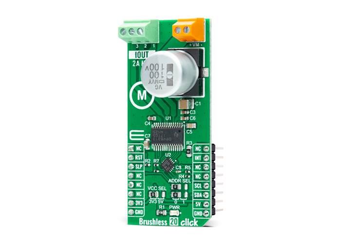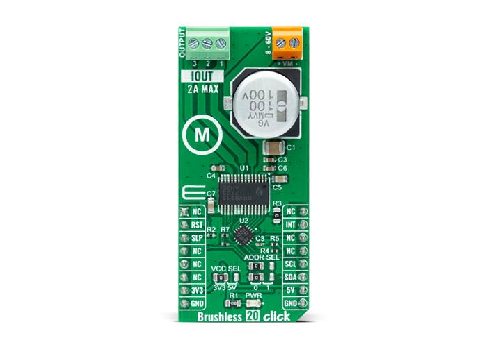 Brushless 20 Click is a compact add-on board that controls brushless DC (BLDC) motors with any MCU. This board features the DRV8313, a fully integrated three-phase BLDC motor driver from Texas Instruments. It provides three individually controllable half-H-bridge drivers intended to drive a three-phase BLDC motor, solenoids, or other loads. Each output driver channel consists of N-channel power MOSFETs configured in a 1/2-H-bridge configuration. Besides, it has a wide operating voltage range from 8V to 60V, alongside several built-in protection circuits such as undervoltage, charge pump faults, overcurrent, and overtemperature. This Click board™ makes the perfect solution for driving three-phase brushless DC motors up to 2A output current rating.