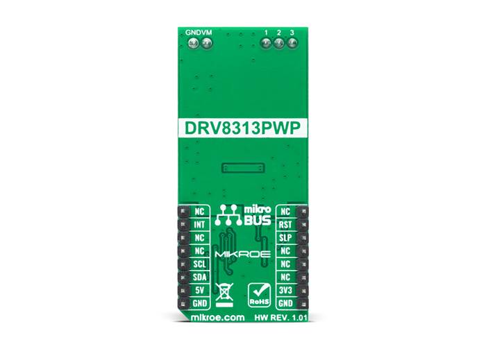 The DRV8313 is active unless the SLP pin, routed to the CS pin of the mikroBUS™ socket, is brought to a low logic state. The charge pump and output FETs are disabled in sleep mode, alongside the internal LDO regulator. The DRV313 is automatically brought out of sleep mode if SLP is brought to a logic high state. This board also supports an external power supply for the motor, which can be connected to the input terminal labelled as VM and should be within the range of 8V to 60V, while the BLDC motor coils can be connected to the terminals labelled as 1, 2, and 3.