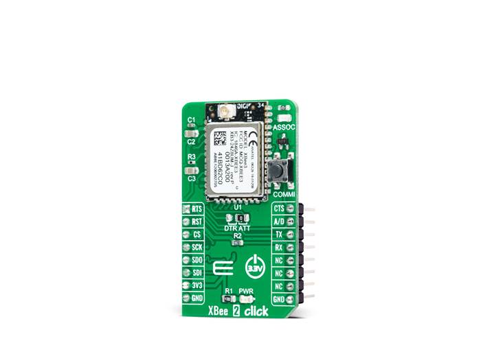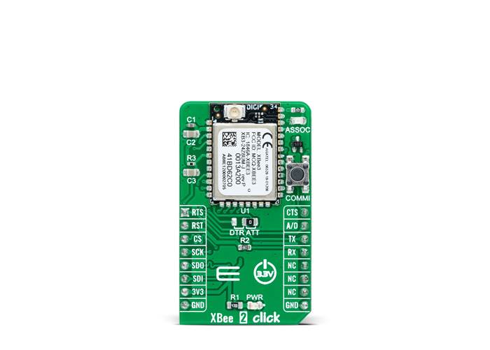 Xbee 2 Click is a compact add-on board providing wireless end-point connectivity to other devices. This board features the XB3-24Z8UM, a Digi XBee® 3 transceiver module offering a fully interoperable ecosystem covering all vertical markets from Digi International. Building on industry-leading technology, the pre-certified Digi XBee® 3 module delivers the flexibility to switch between multiple frequencies and wireless protocols as needed (Zigbee, 802.15.4, DigiMesh® and BLE). It can be easily configured and controlled from a simple, central platform and comes with built-in Digi TrustFence® security, identity, and data privacy features which use more than 175 controls to protect against new and evolving cyber threats. This Click board™ is suitable for broad smart-energy applications, wireless alarms and security, building automation, and others.