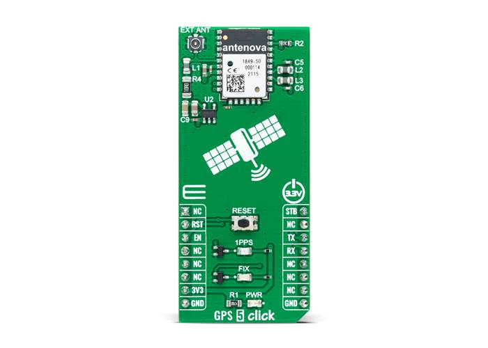 In addition to precise positioning, the GPS 5 Click also has an accurate timing signal indicated via a red LED indicator marked as 1PPS, a blue LED indicator marked with FIX, which shows once a GPS fix has been obtained, as well as the possibility of using an external active antenna which can also be found in our offer, activated through EN pin of the mikroBUS™ socket.