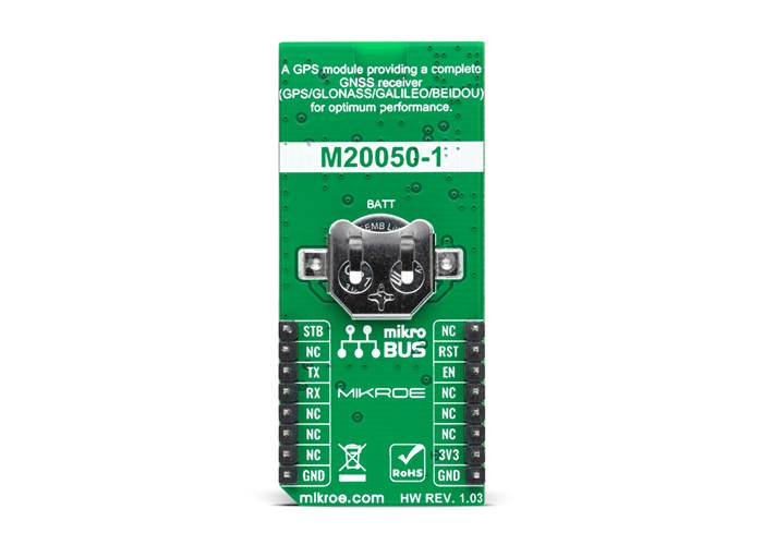 GPS 5 Click as its foundation uses the M20050-1, an integrated GNSS receiver module with an integrated antenna incorporating the MediaTek MT3333 flash chip from Antenova. The M20050-1 tracks 3 GNSS constellations concurrently (GPS+Galileo+GLONASS or GPS+Beidou) to considerably enhance the location and has configurable low power modes alongside acquisition and tracking sensitivity of -163dBm and -165dBm. This module offers indoor and outdoor multi-path detection and compensation and has an accurate 0.5ppm TXCO that ensures short TTFF besides an active interference cancellation (AIC) feature. This Click board is ideal for asset tracking/ personal safety, navigation devices, and sports equipment applications based on good attributes.