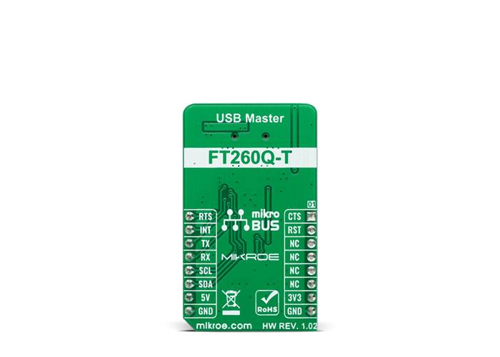 This Click board™ can communicate with MCU via UART or I2C interface. The FT260Q uses the UART interface with commonly used UART RX and TX pins and hardware flow control pins UART CTS and RTS (Clear to Send and Ready to Send) to transmit and exchange data with the host MCU or using the I2C interface, which can also act as a controller with a maximum I2C bus speed of up to 3.4Mbit/s. These two interfaces exist concurrently and can be selected independently according to the application.