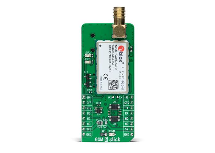 GSM 5 Click is a compact add-on board representing a compact GSM cellular network communication solution. This board features the SARA-G450, a GSM/GPRS quad-band cellular module certified and approved by the main regulatory bodies and operators from u-blox. It features class 12 GSM/GPRS connectivity in the popular u-blox SARA form factor and comes with a comprehensive feature set, including an extensive set of internet protocols designed to provide fully integrated access to u-blox GNSS positioning with embedded A-GPS (AssistNow Online and AssistNow Offline) functionality. Besides a data rate up to 85.6 kbps and an advanced jamming detection feature, this board also offers a high-quality integrated audio interface allowing voice communication. This Click board™ is suitable for price-to-performance 2G cellular module M2M applications, such as utility metering and tracking systems.