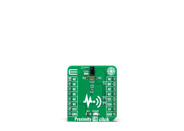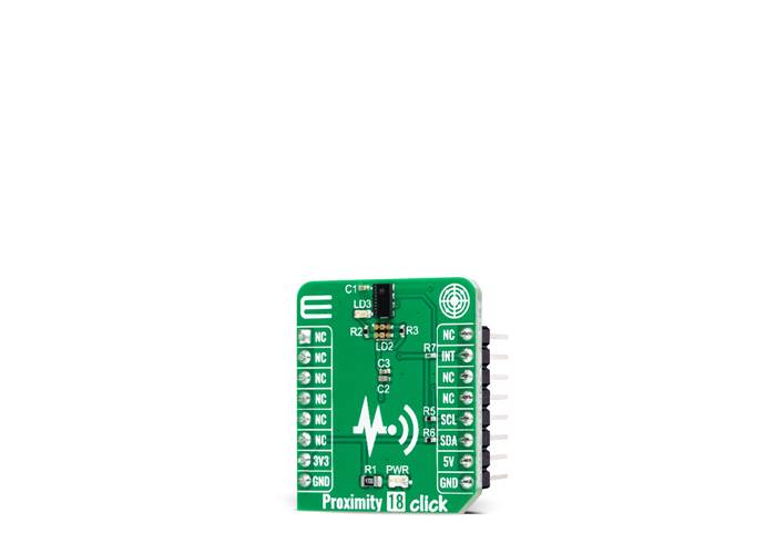 Proximity 18 Click is a compact add-on board that provides a close-range proximity sensing solution. This board features the VCNL3036X01, a high-resolution digital proximity sensor from Vishay Semiconductors. Besides the proximity sensing element, the VCNL3036X01 also integrates a mux and a driver for three external LEDs, which are located near the chip on the board, photodiodes, amplifiers, and analogue to digital conversion circuits into a single CMOS chip. Proximity 18 Click provides absolute distance measurement, whatever the target colour and reflectance, and is accurate up to 50cm. This Click board™ is suitable for proximity/optical switch applications for consumer, computing, automotive, and industrial purposes.