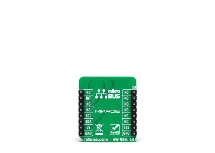 A further benefit is that the VCNL3036X01 also provides a programmable interrupt feature of individual high and low thresholds, resulting in the best utilisation of MCU resources and power, routed to the INT pin on the mikroBUS™ socket. If the interrupt function is enabled, the host reads the proximity output data from VCNL3036X01, which saves the host loading from periodically-read proximity data. More than that, an interrupt flag indicates the interrupt behaviour triggered under different conditions. Once the host reads the result, the interrupt is cleared, and the ranging sequence can repeat.