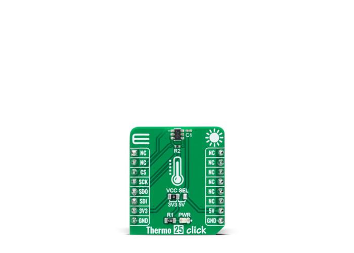 Thermo 25 Click is a compact add-on board that accurately measures temperature. This board features the TMP127-Q1, a high-precision digital temperature sensor from Texas Instruments. This SPI-configurable factory-calibrated temperature sensor has a high accuracy of 0.8°C, supporting an ambient temperature range from -55°C to 175°C. It features a 14-bit signed temperature resolution (0.03125 °C per LSB) while operating over a supply range. This Click board™ is appropriate for thermal management of various automotive, industrial, and environmental applications.