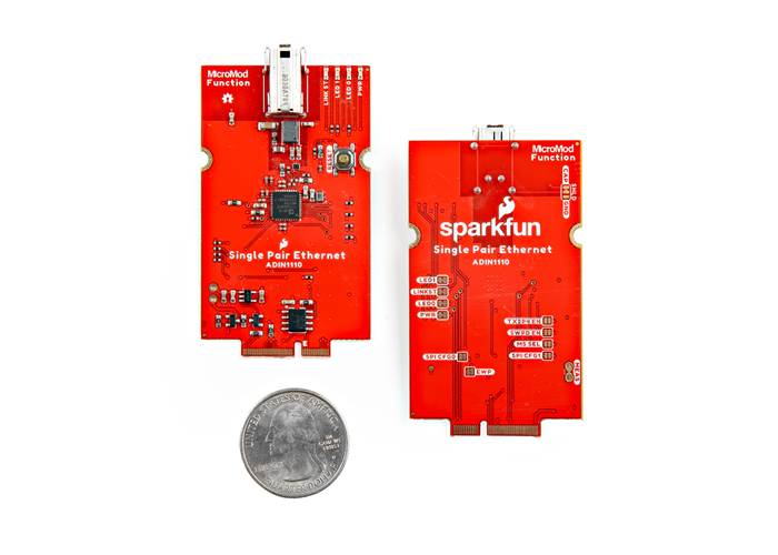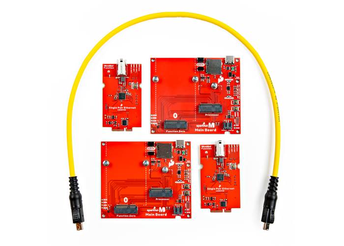 The SparkFun MicroMod Single Pair Ethernet Kit demonstrates 10BASE-T1L Two-Wire Ethernet protocol within the SparkFun MicroMod ecosystem by using two SparkFun MicroMod Single Pair Ethernet Function Boards and including all the accessories to run a proof of concept example over 0.5 meters of cable...