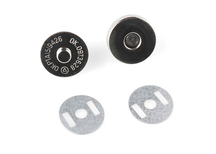 A snap is fun, but a magnetic snap adds a whole new layer of possibilities. This are relatively large 18mm diameter snaps (all three pieces come as shown). They couple together very strongly (must be pried apart), rotate freely on the axis, and are electrically conductive.