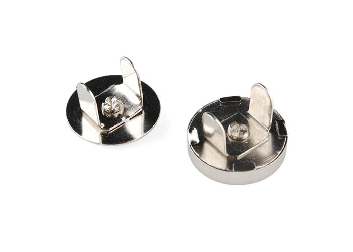 A snap is fun, but a magnetic snap adds a whole new layer of possibilities. This are relatively large 18mm diameter snaps (all three pieces come as shown). They couple together very strongly (must be pried apart), rotate freely on the axis, and are electrically conductive. We’ve seen snaps like these soldered onto PCBs and batteries to form a strong, but quick disconnect mechanism. Overall connection resistance is less than 200 miliOhm. Snaps will couple when closer than 10mm.