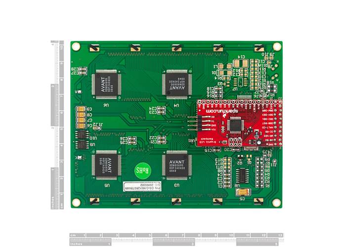 This is a very large serial graphic LCD. The Serial Graphic LCD backpack is soldered to the 160x128 pixel “Huge” Graphic LCD and provides the user a simple serial interface to a full range of controls.