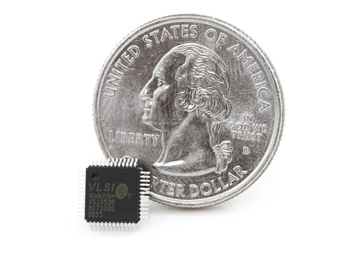 VS1053b from VLSI is a single-chip Ogg Vorbis/MP3/AAC/WMA/MIDI audio decoder and an IMA ADPCM and user-loadable Ogg Vorbis encoder. It contains a high-performance, proprietary low-power DSP processor core VS DSP4, working data memory, 16 KiB instruction RAMand 0.5+ KiB data RAM for user applications running simultaneously with any built-in decoder, serial control and input data interfaces, upto 8 general purpose I/O pins, an UART, as well as a high-quality variable-sample rate stereo ADC (mic, line, line + mic or 2×line) and stereo DAC, followed by an earphone amplifier and a common voltage buffer.