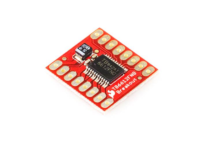 The TB6612FNG motor driver can control up to two DC motors at a constant current of 1.2A (3.2A peak). Two input signals (IN1 and IN2) can be used to control the motor in one of four function modes - CW, CCW, short-brake, and stop.