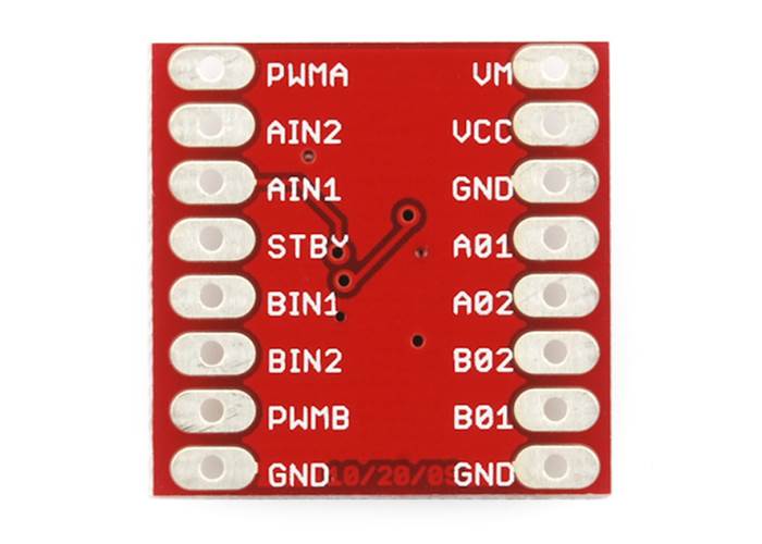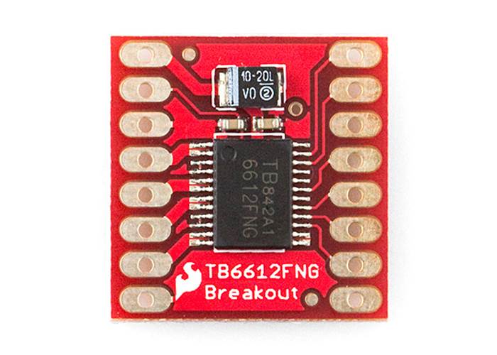 Board comes with all components installed as shown. Decoupling capacitors are included on both supply lines. All pins of the TB6612FNG are broken out to two 0.1" pitch headers; the pins are arranged such that input pins are on one side and output pins are on the other.