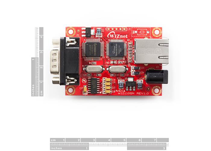 The main components of the WIZ110SR are a WIZnet W5100 embedded ethernet controller chip and an 8051 complaint MCU. Also included on the board are DB9 and RJ45 connectors and a 5.5x2.1mm barrel jack. To power the board, a 5V power adaptor is required.