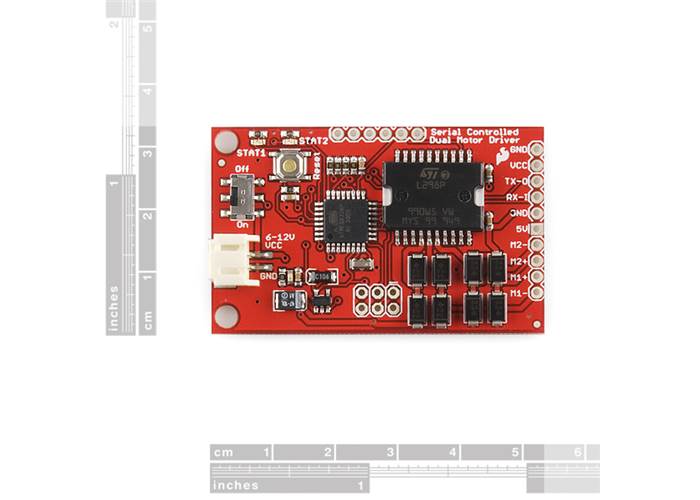 The SparkFun Serial Controlled Motor Driver allows you to control up to two DC motors using a serial command interface.